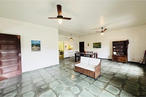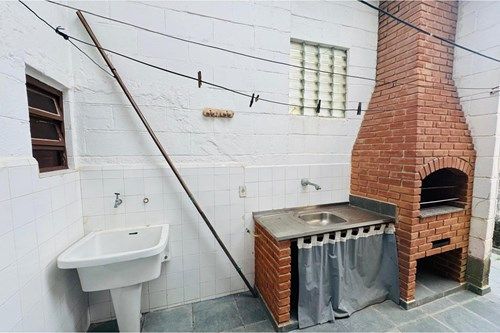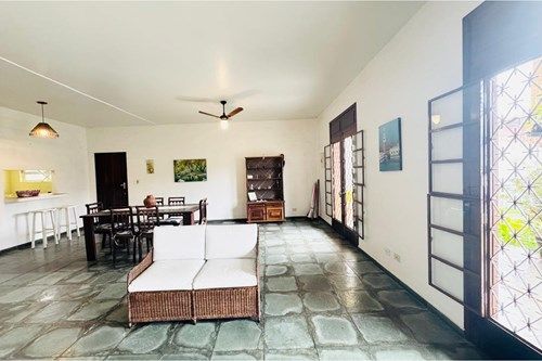 Sala ampla com três ambientes integrados, pé-direito alto, cozinha funcional, área de serviço, lavanderia, jardim frontal, espaço gourmet com churrasqueira e edícula independente com 2 dormitórios, sala, cozinha e banheiro.