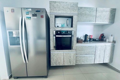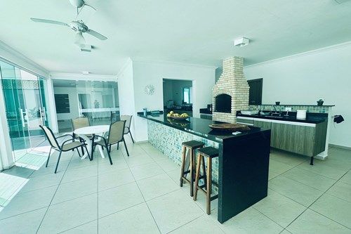 A cozinha planejada em conceito aberto integra-se harmoniosamente à área de convivência, combinando funcionalidade e design moderno. Um amplo painel de vidro voltado para a área externa valoriza a entrada de luz natural e cria uma conexão agradável com o lazer.